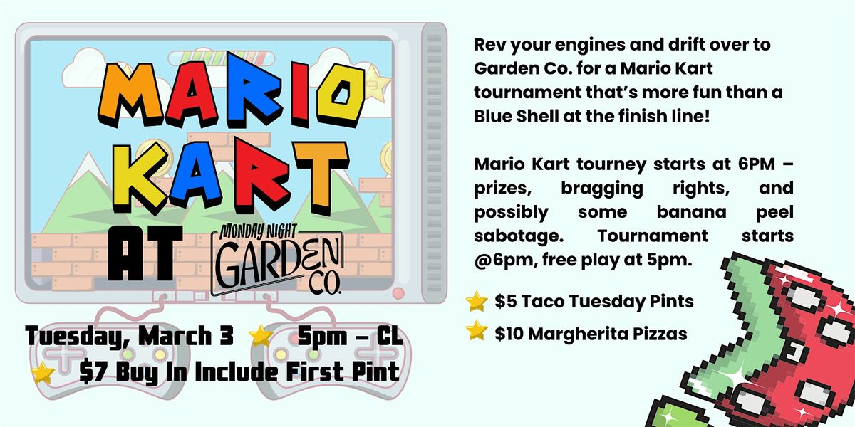 Get ready for an adrenaline-pumping night of Mario Kart mayhem at Monday Night Garden Co.! 🚗💨 Whether you're a karting newbie or a seasoned racer, we've got something for everyone!