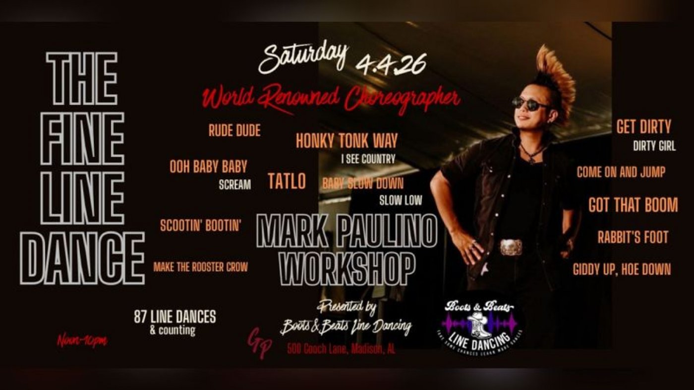 Mark Paulino Workshop - The Fine Line Danceđ World-Renowned Choreographer Mark Paulino Comes to Huntsville, AL! đ Get ready to dance, learn, and connect with the one and only Mark Paulino â the creative force behind viral hits like Rude Dude, Honky Tonk Way (I See Country), Baby Slow Down (Slow Low), and many more! With over 87 choreographies to his name Mark brings his signature style and energy to this unforgettable event. đ Event Highlights: â¨Â Five-Hour Workshop â learn from one of the best in line dance- broken into two sessions â¨Social Dancing â dance the night away with Mark Paulino and fellow line dance enthusiasts during registration, at breaks, and from 7-10pm â¨Catered Event â enjoy great food and great company â¨Held in a beautiful ballroom in the heart of Madison AL â¨Cash Bar đLocation: New Gooch Place @ 500 Gooch Lane Madison AL đ Date: Saturday April 4 2026 đ Time: noon-10pm