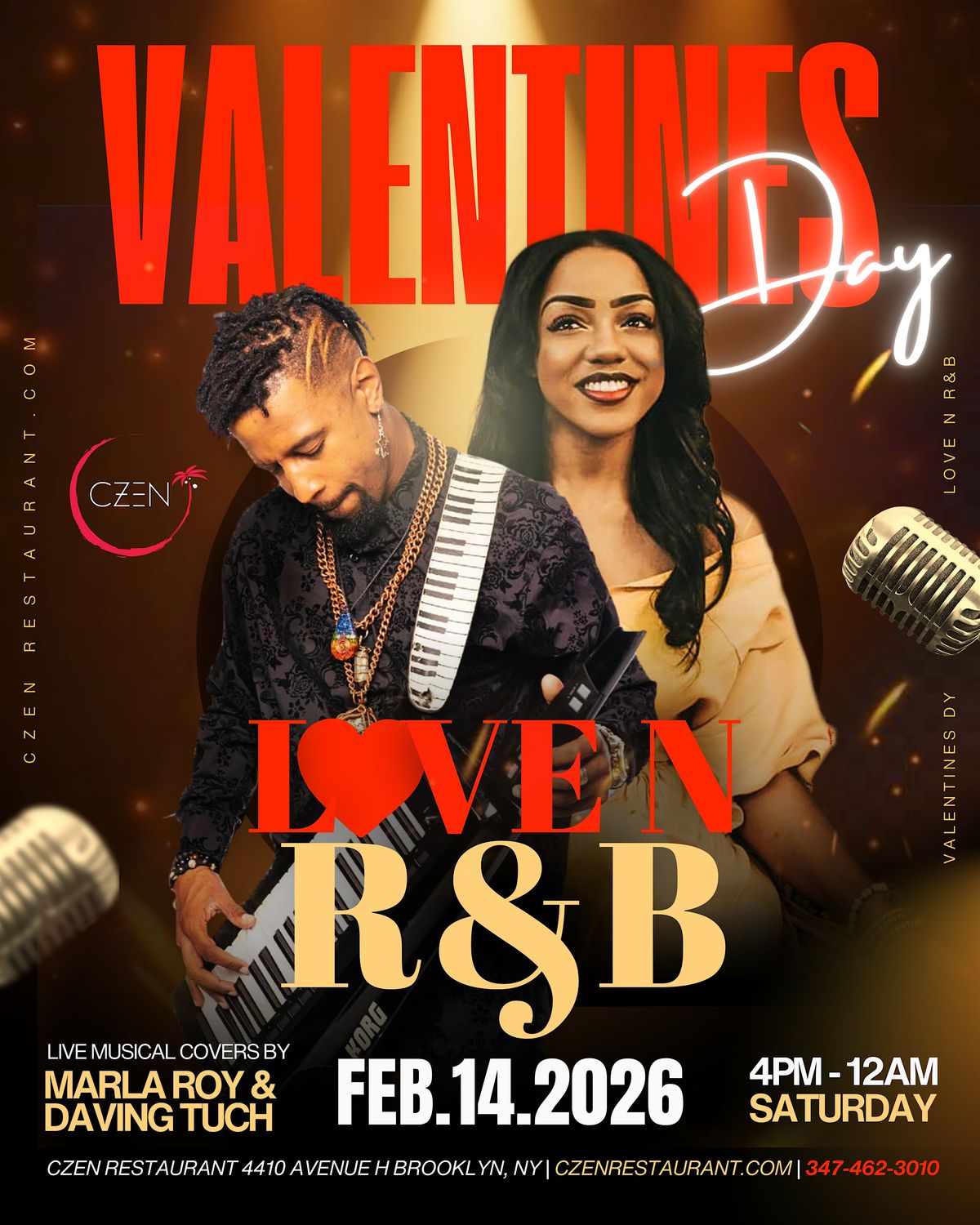 Celebrate love this Valentine’s Day at CZEN Restaurant with an elevated dining and live music experience you won’t forget. On Saturday, February 14, 2026, immerse yourself in an evening of Love N R&B as Marla Roy and Daving Tuch deliver soulful live covers that set the perfect romantic tone while you dine.