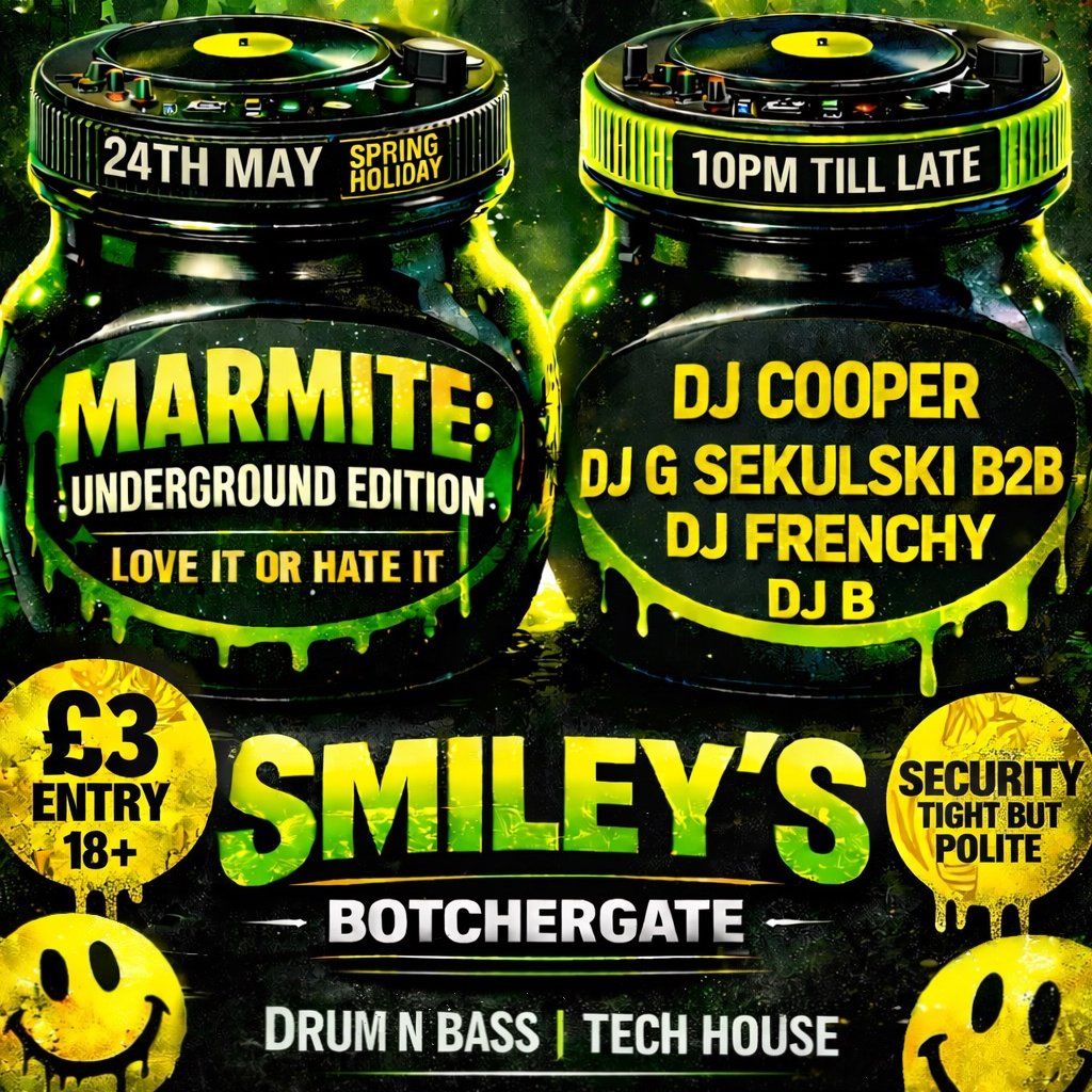 Marmite Bass Edition hits Smiley's! DnB, Jungle & UKG all night. 24th May, 10PM till late. £3 entry. Love it or hate it... be there!Artists