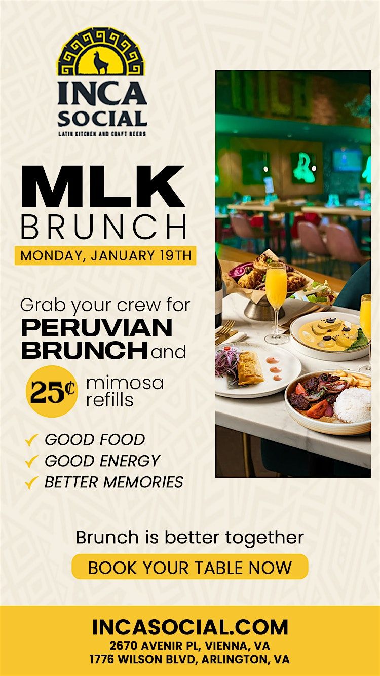 Celebrate MLK Jr. Day with us at Inca Social! Join us for a special brunch event honoring the legacy of Martin Luther King Jr. Enjoy delicious food, great company, and a meaningful tribute to this iconic civil rights leader. Let's come together to reflect and celebrate his vision for equality and justice. Don't miss out on this opportunity to connect with your community and pay homage to a true American hero.