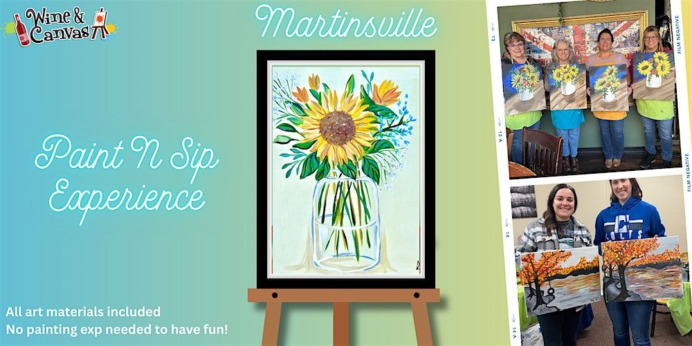 Join us at Main Street Grill for a Martinsville Paint and Sip as we paint Sunflower in a Vase! It is a vibrant and colorful painting of a gorgeous sunflower arrangement bursting from a charming vase. This class is perfect for a date night, a night out with friends, or a solo evening of creativity.