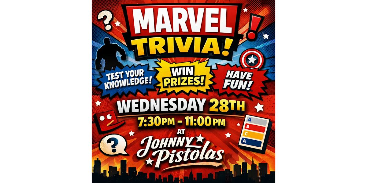 Get ready to test your knowledge of all things Marvel in person! Join us for a fun and casual trivia night at Johnny Pistolas, where geeks and heroes unite. Whether you're a die-hard fan or just love some superhero action, come hang out, show off your skills, and enjoy a great vibe. Can't wait to see you there!