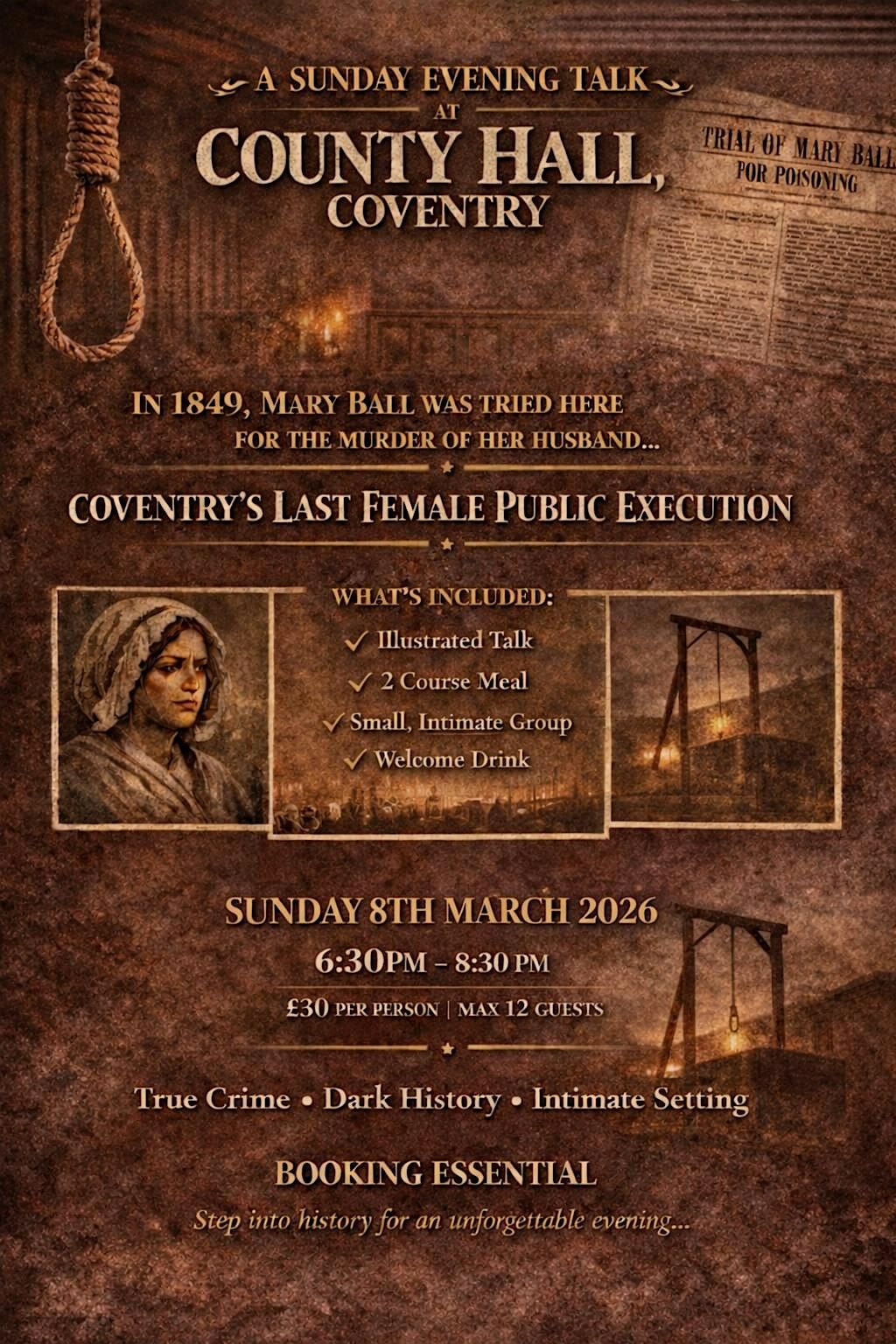 Join us on a Sunday evening from 6:30 pm. to 8:30 pm for an engaging talk exploring the life, trial, and execution of Mary Ball, told in the exact place where her fate was decided. Set against the atmospheric backdrop of this Grade II* listed building, the evening blends true crime history with a relaxed social experience.