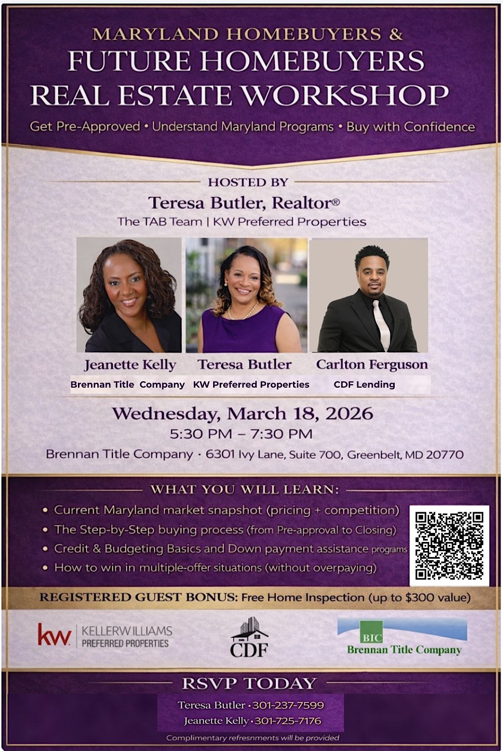 Join Teresa Butler for a high-impact Maryland Homebuyers Workshop designed to help you move from “thinking about buying” to a clear, confident plan. In this session, you’ll learn what today’s market requires, how to prepare financially, and how to position yourself to win the right home without feeling overwhelmed.
