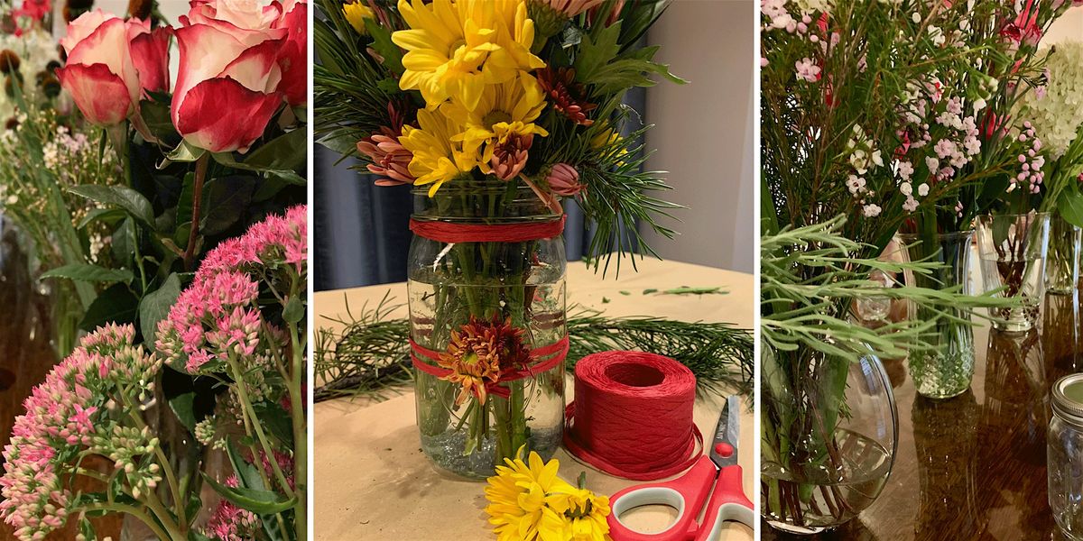 - You will be provided with all the necessary materials: a mason jar, a variety of fresh flowers/greenery, ribbons and decorative elements.