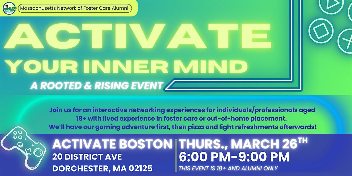 Come join us for our 3rd Rooted & Rising event at Activate Boston! This is an interactive networking experience designed specifically for adults 18 and older with lived experience in foster care or out-of-home placement. Meet others, build relationships, and enjoy some friendly competition in a welcoming, low-pressure environment!