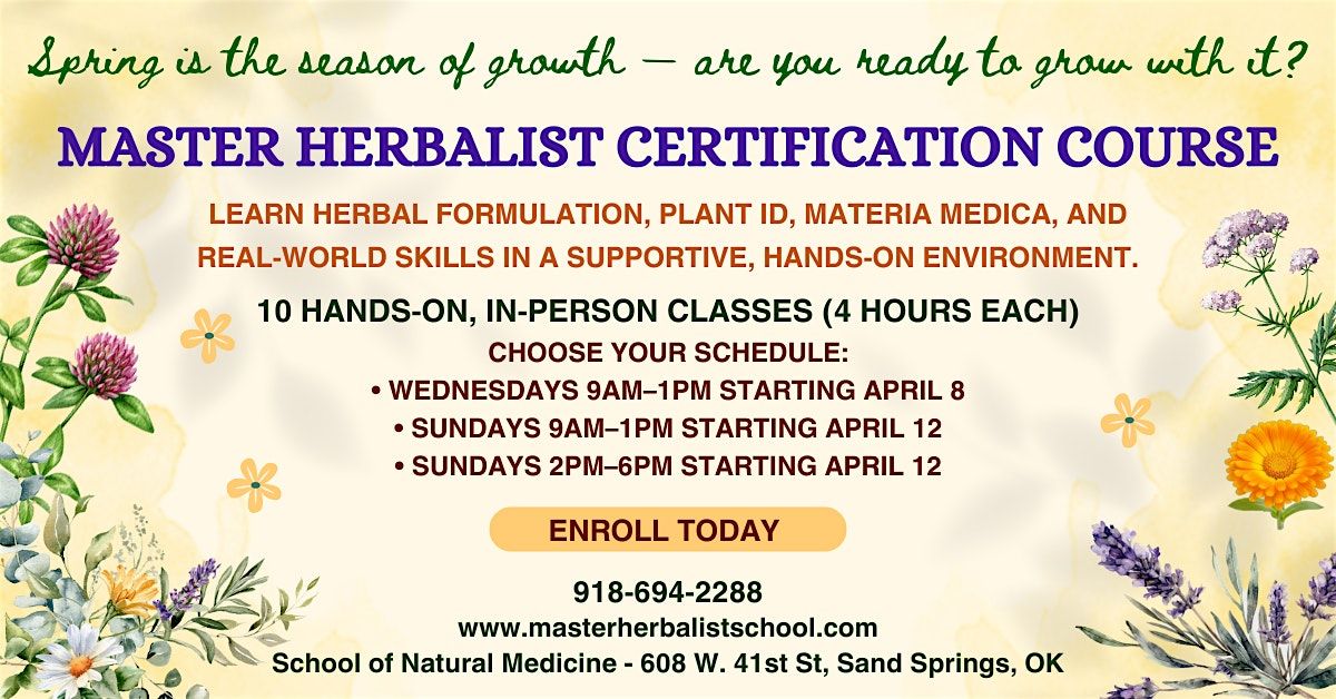 To enroll or for more information contact us at 918-694-2288, www.masterherbalistschool.com or [email protected]