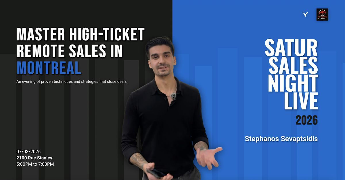 Ready to master objection handling and proven sales techniques that close high-ticket deals? Join us for SaturSales Night Live, an interactive evening designed specifically for remote sales professionals in Montreal. Whether you're a seasoned closer or just breaking into high-ticket sales, you'll walk away with actionable strategies, real-world techniques, and the confidence to handle any objection that comes your way. Don't miss this opportunity to elevate your sales game and connect with other top performers in the city. See you there!
