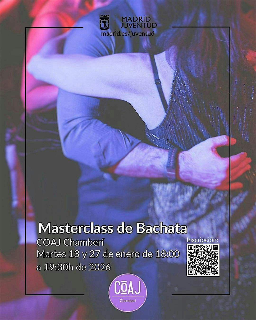 Si tienes entre 14 y 30 años, siente el ritmo y déjate llevar en esta masterclass de bachata, donde aprenderás los pasos básicos, movimientos sensuales y técnica para brillar en la pista. No importa tu nivel, solo necesitas ganas de bailar y pasarlo bien. ¡Ven a mover el cuerpo y disfrutar de una tarde con mucho flow!