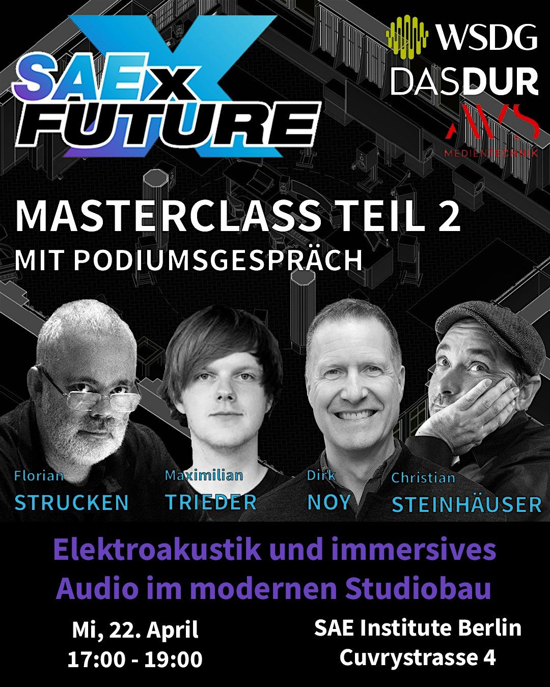 Am 22. April von 17:00 bis 19:00 Uhr bringt SAEx FUTURE vier Experten aus Akustik, Architektur und Studio-Praxis ins SAE Institute Berlin – für eine Masterclass und ein offenes Podiumsgespräch, das zeigt, wie moderner Studiobau in der Realität funktioniert.