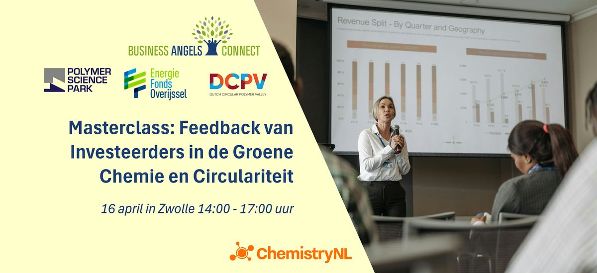 Deze masterclass wordt georganiseerd door Business Angels Connect in samenwerking met Energiefonds Overijssel en Polymer Science Park. Het evenement is onderdeel van de activiteiten van Business Angels Connect om ondernemers voor te bereiden op de private investeerdersmarkt en de kans op een succesvolle financiering te vergroten. Het evenement wordt ondersteund door ChemistryNL.