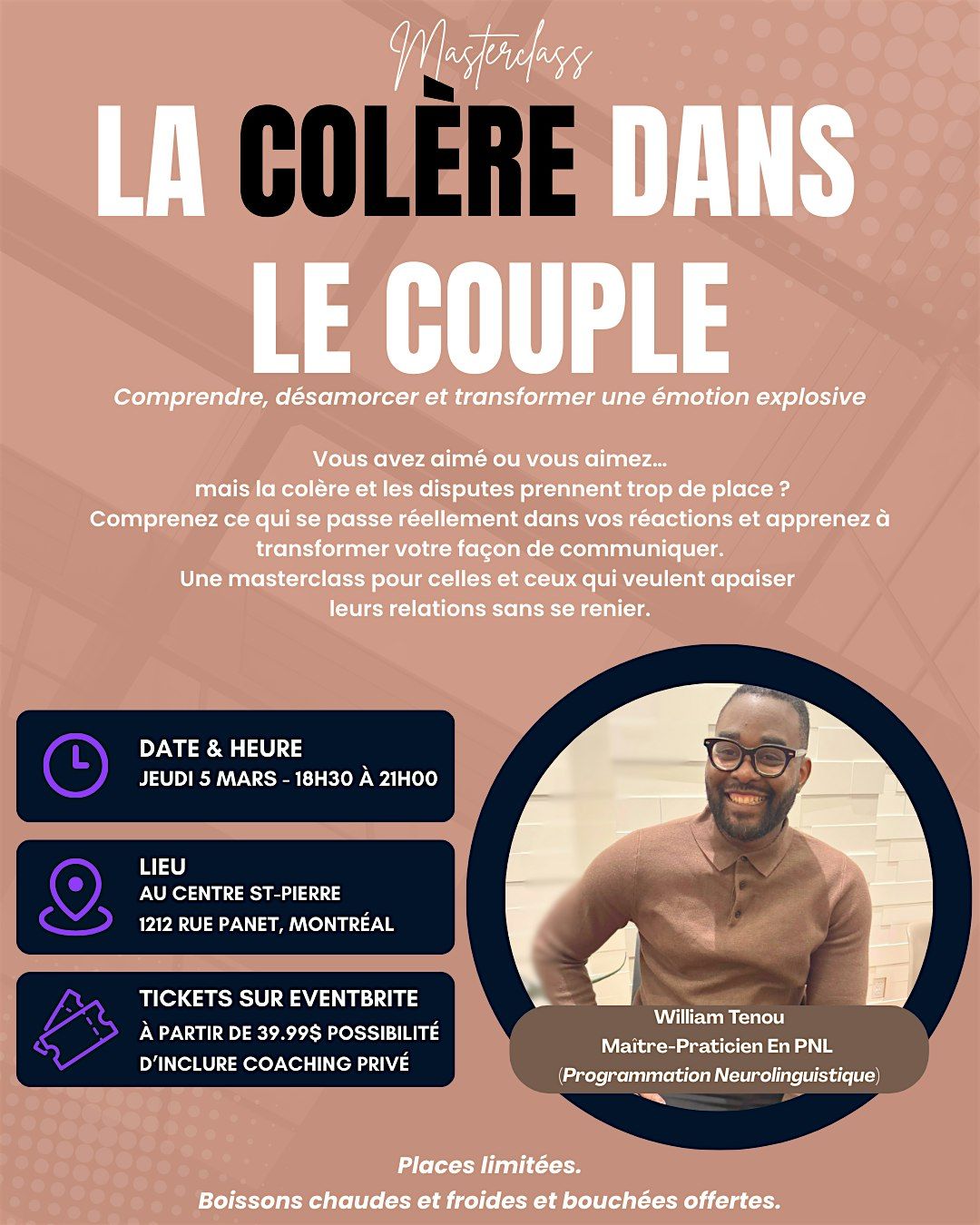 La masterclass, dirigée par William Tenou, Maître-Praticien en PNL, mêlera théorie, conseils pratiques et moments d’introspection guidée. Vous serez accompagné pas à pas pour observer vos réactions, identifier vos déclencheurs et expérimenter des outils simples pour transformer vos tensions en compréhension et en communication consciente.