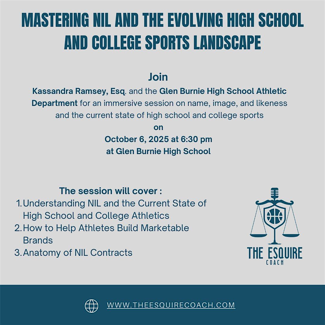 Come join us at Glen Burnie High School for an exciting event focused on navigating the world of Name, Image, and Likeness (NIL) in sports, as well as exploring the changing landscape of high school and college athletics. Whether you're an athlete, coach, parent, or athletics staff, this event is packed with valuable insights and discussions. Don't miss out on this opportunity to stay ahead in the game!