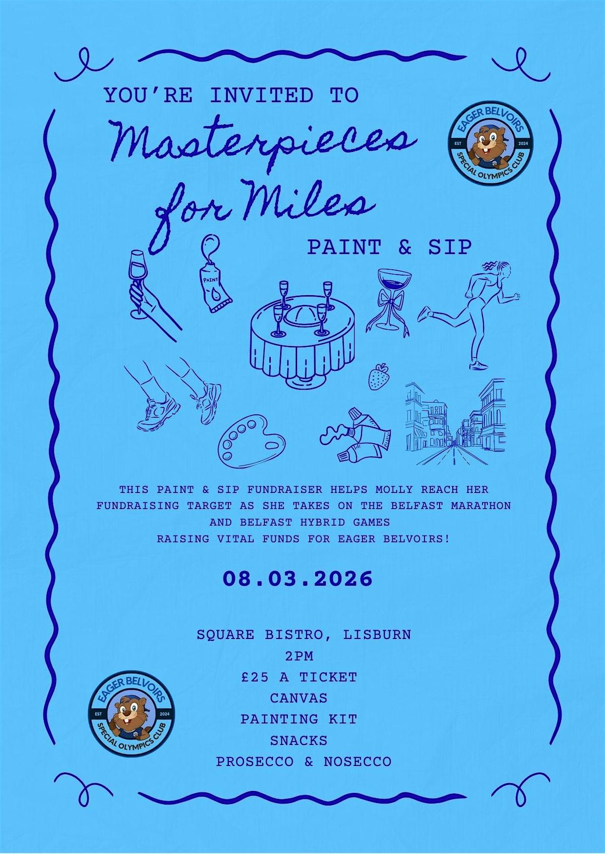 Masterpieces for Miles is a fun Paint & Sip fundraising event supporting Eager Belvoirs Special Olympics Club.About this Event