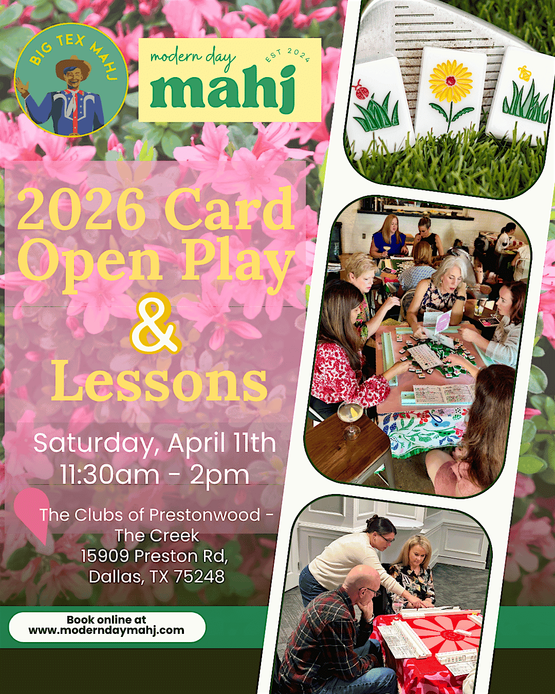 Experience the best of both worlds, Masters AND Mahj! Join us for an afternoon of Open Play on the new NMJL 2026 Card. The tables will be set at The Clubs of Prestonwood-The Creek (15909 Preston Rd, Dallas, TX 75248) from 11:30am - 2:00pm. We will have a few 2026 cards, so if you have received yours, feel free to bring it. Masters themed fare will be available for purchase and the Pink Azalea cocktails will be flowing!