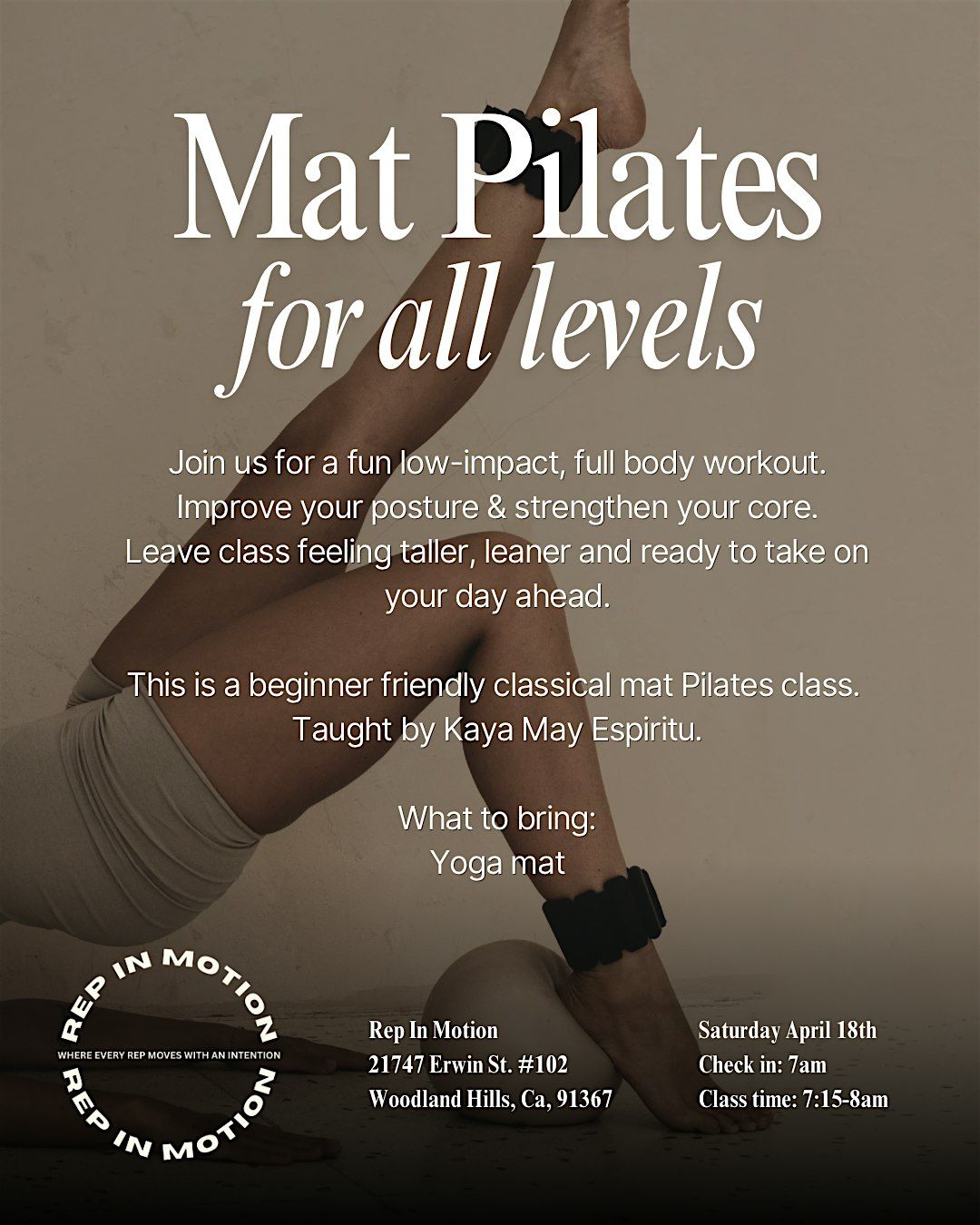 Ready to stretch, strengthen, and have fun? Join us for Mat Pilates by Kaya, an awesome in-person session where you'll work your core, improve flexibility, and leave feeling energized. Perfect for all levels—whether you're a beginner or a Pilates pro, Kaya's got you covered. Bring your mat, comfy clothes, and let's get moving together!