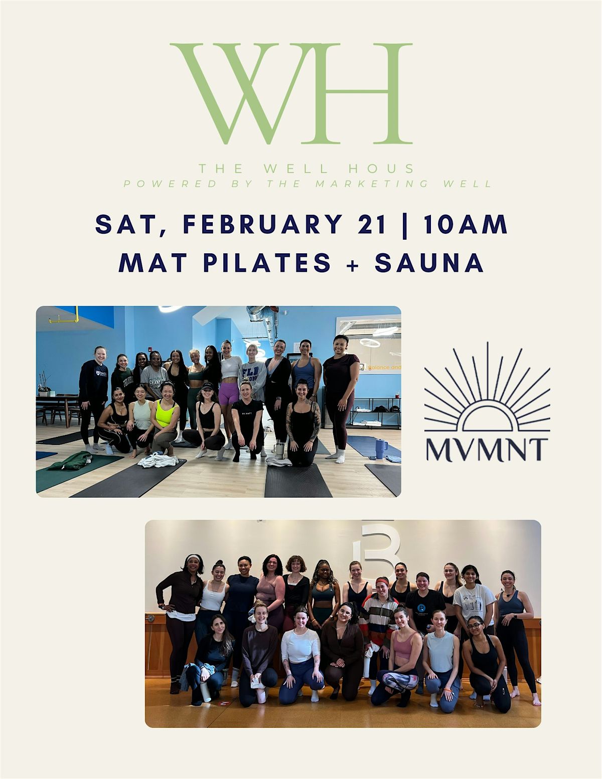 We’re kicking things off with a fun mat pilates class followed by a rejuvenating group sauna session.