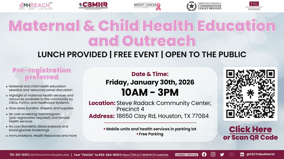 The Maternal & Child Health Education and Outreach Event brings together families, healthcare providers, and community organizations to promote maternal and child wellness. Attendees will receive valuable health education, access to no-cost screenings, community resources, and essential supplies.
