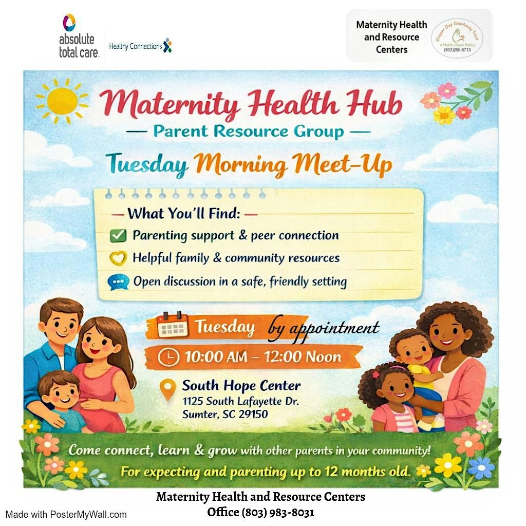 Welcome to the Maternity Health Hub – Parent Resource Group Tuesday Morning Meet-Up! Join us at South Hope Center Tuesdays- by appointment .. for a wonderful gathering of parents like you.