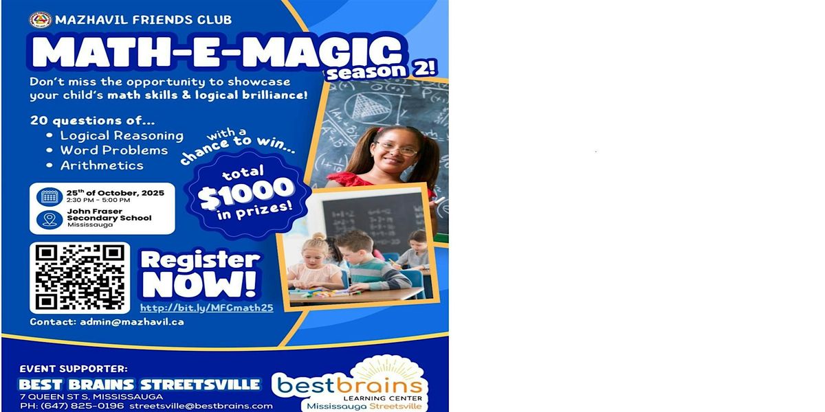 Mazhavil Friends Club announces the upcoming Mazhavil Math-e-Magic, a Math contest for children in grades 4 -10. Our contest, scheduled to take place on 25th Oct 2025 at Mississauga, aims to create an engaging and educational experience for young minds passionate about mathematics by providing them with a platform to showcase their talent and skills and win !!
