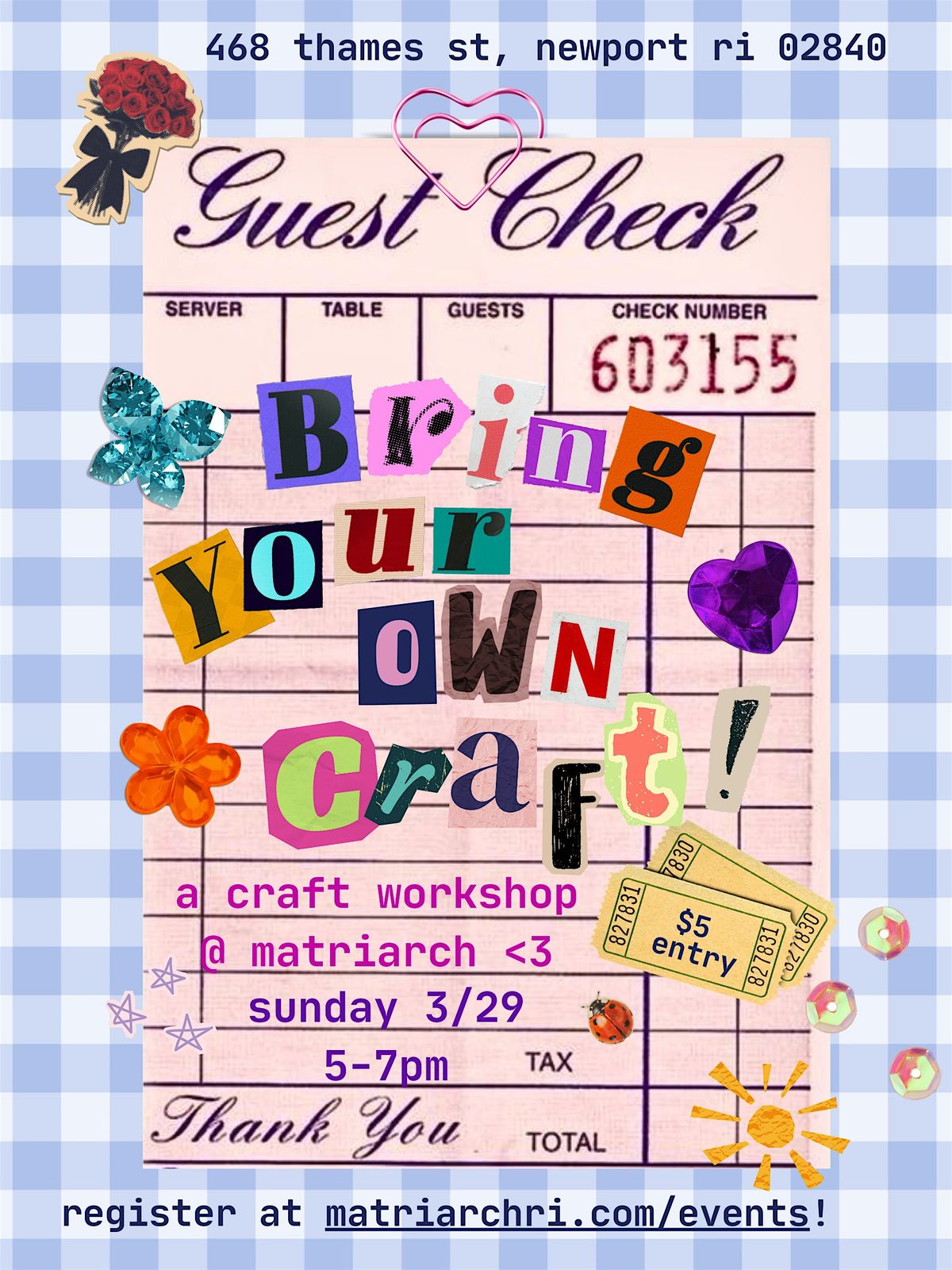 Come and commune with fellow crafters and just work on your current project in the colorful Matriarch shop. All crafts are welcome- knitting, crocheting, collagingm painting, embroidery, needlepoint, etc.