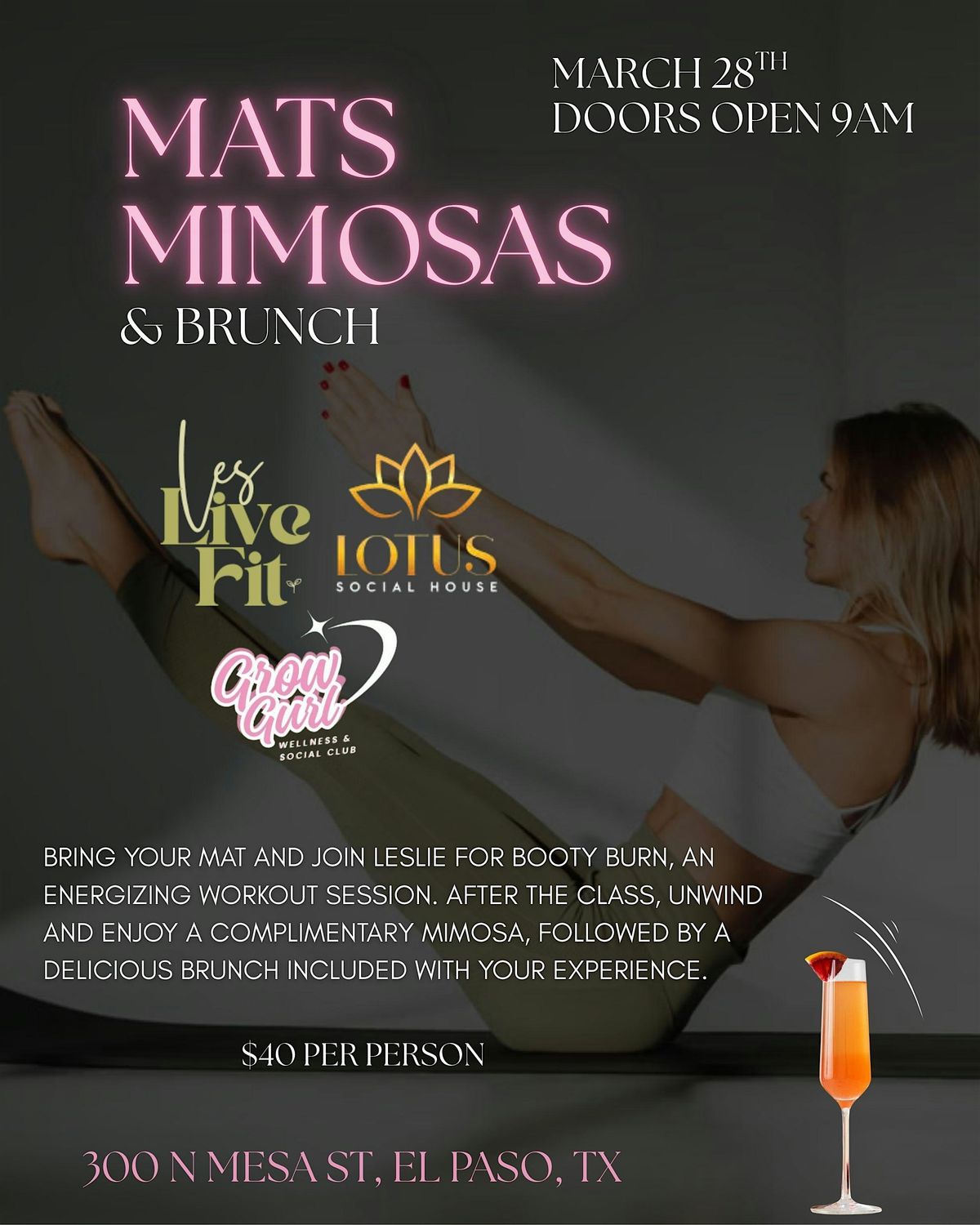 Bring your mat and join Leslie for Booty Burn, an energizing workout session. After the class, unwind and enjoy a complimentary mimosa, followed by a delicious brunch included with your experience.