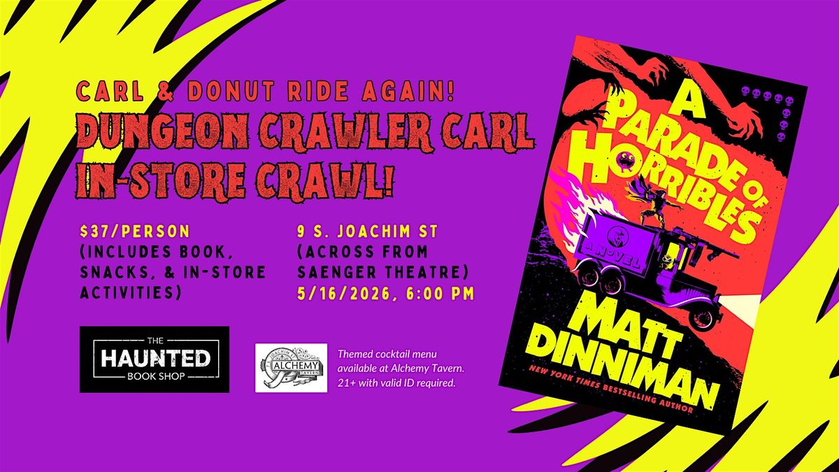 Join us on May 16th at The Haunted Book Shop for an in-store party celebrating A Parade of Horribles, the next installment in the best-selling Dungeon Crawler Carl series. Dive into Carl's latest adventure with the new book, specialty Dungeon Crawler-themed cocktail menu at Alchemy Tavern (next door to the shop, 21+ with valid ID), an in-store crawl with mini quests, loot boxes, and snacks. The fun starts at 6pm at 9 S Joachim St. Trust us when we say the AI will not be pleased if you refuse.