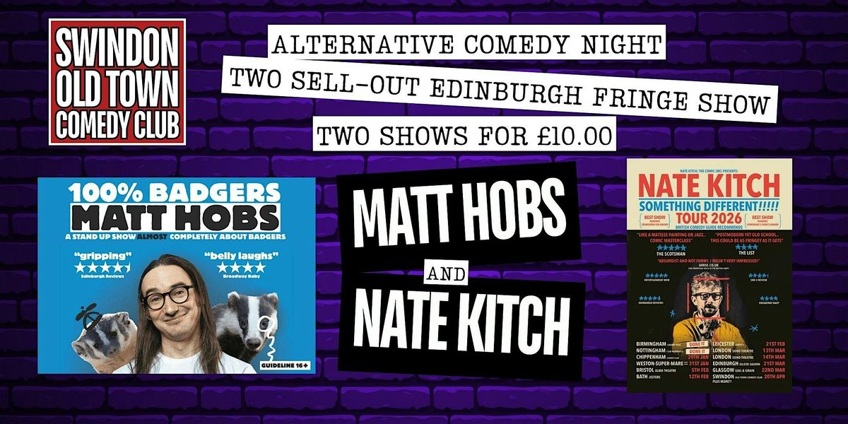The Swindon Old Town Comedy Club hosts a night of Alterntaive Comedy with Matt Hobs: 100% Badgers, the sell-out Edinburgh Fringe stand-up show about how the worlds of humans and badgers collide + Nate Kitch: Something Different!!!!, the sell-out 5 Star Rated Edinburgh Fringe stand-up show!