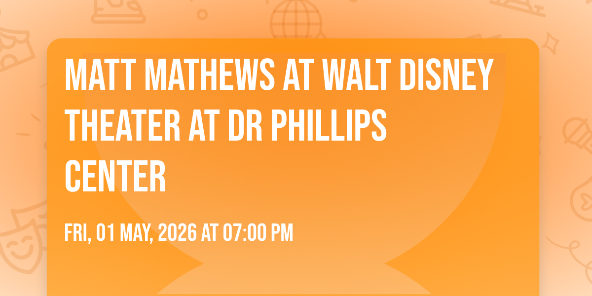 🎉 Welcome to Matt Mathews at Walt Disney Theater at Dr Phillips Center, where dreams come alive and possibilities are endless! 🏛️ Join us at Walt Disney Theater at Dr Phillips Center in the heart of Orlando, FL for an event that defies expectations. 📅 On May 1st, 2026 at 07:00 PM, be part of something truly extraordinary as we bring together innovation, entertainment, and pure magic. ✨ Every aspect has been carefully designed to ensure an unforgettable experience for all our guests. Whether you're seeking adventure, inspiration, or simply a break from the ordinary, this event promises to deliver beyond your wildest dreams. 🎊 Prepare for a journey into the extraordinary!