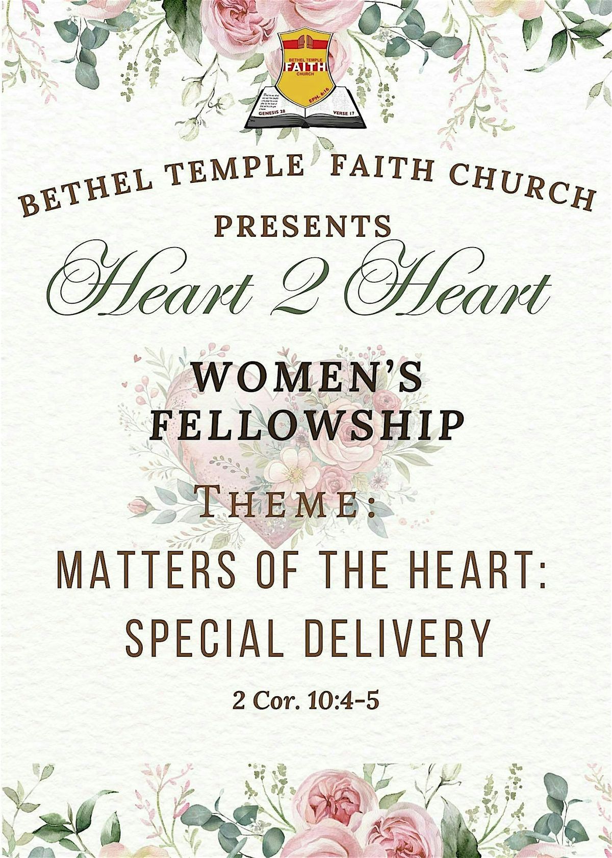 Bethel Temple Faith Church invites you to join us for a powerful and uplifting women's fellowship experience at Matters of the Heart: Special Delivery! This special gathering is designed to encourage, refresh, and inspire women as we come together in faith, fellowship, and love.