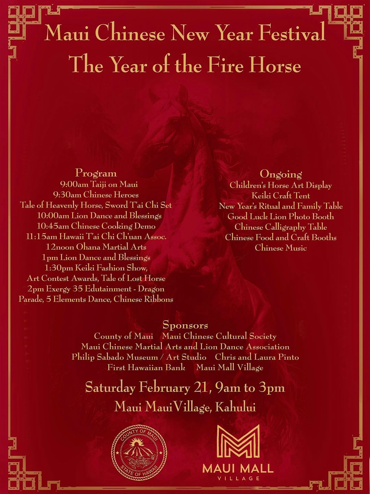 Celebrate the year of the Horse with us at Maui Chinese New Year Festival 2026, Saturday, February 21, Maui Mall Village 9 a.m. – 3 p.m. Instagram @CNYFestMaui, facebook @cnyMaui. This festival is organized by volunteers who love Chinese & Asian culture.