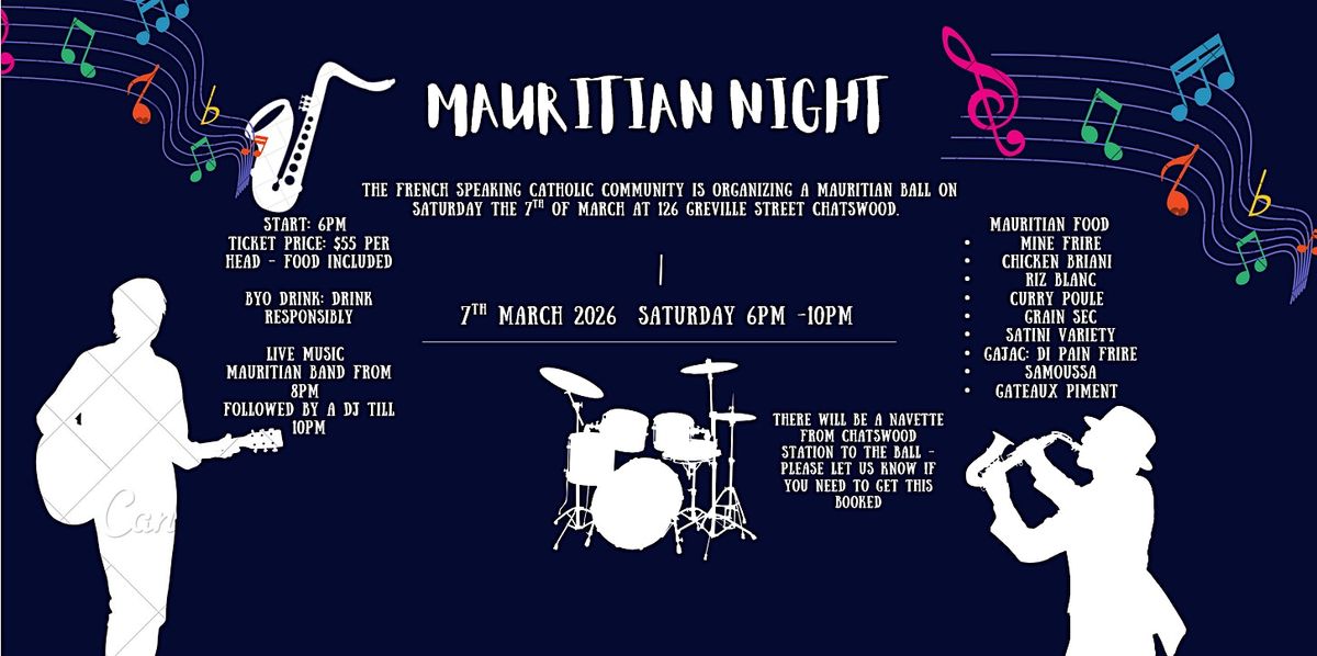 This will be a Mauritius Ball with live music, great food and good friends. The French speaking Catholic Community has organized this.