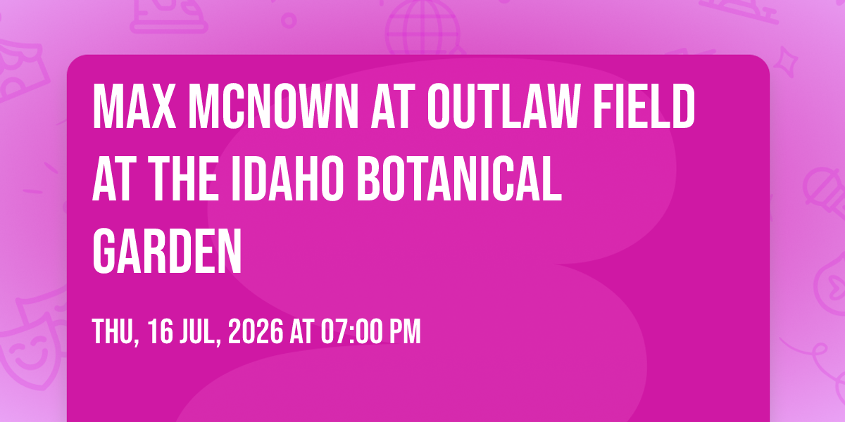 🎉 Welcome to Max McNown at Outlaw Field at the Idaho Botanical Garden, where the impossible becomes possible and dreams take flight! 🏛️ Join us at Outlaw Field at the Idaho Botanical Garden in the heart of Boise, ID for an event that will redefine your expectations. 📅 On July 16th, 2026 at 07:00 PM, witness the transformation of space and time into something truly magical. ✨ It's a curated experience combining the best of innovation, entertainment, and community spirit, creating moments that will be remembered for years to come. Whether you're a first-time visitor or a seasoned enthusiast, prepare to be amazed. 🎊 Book now to ensure your place in this unforgettable experience!