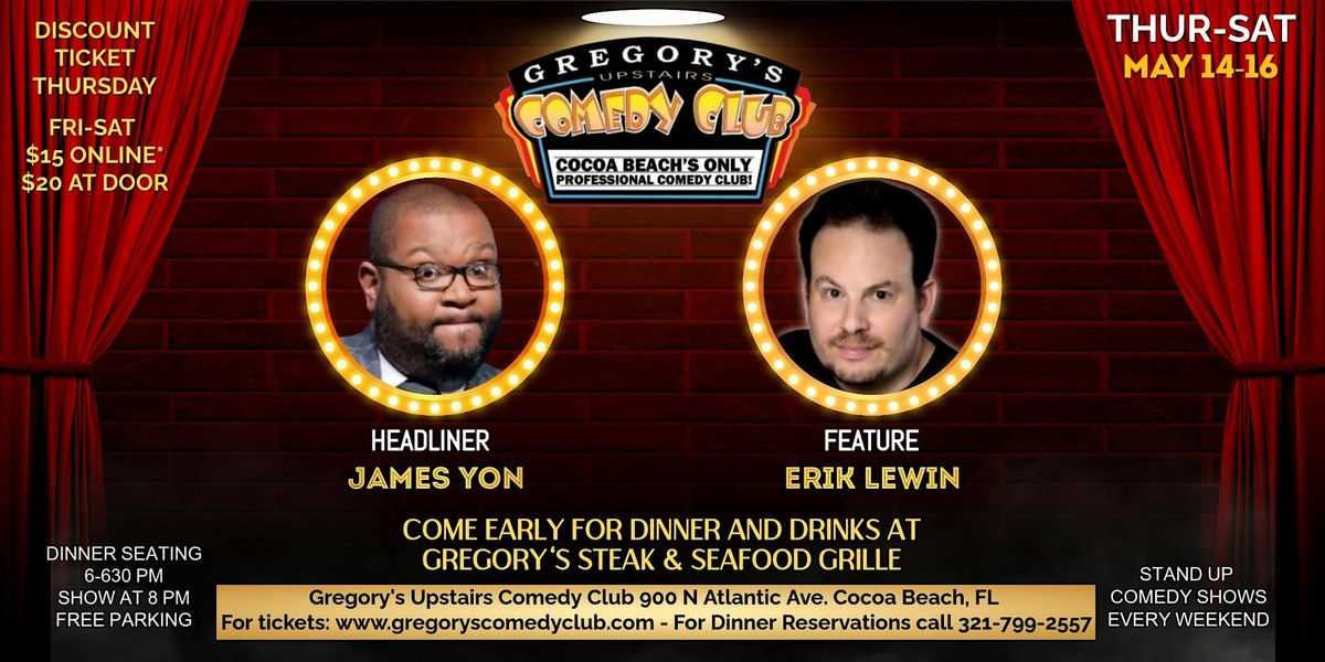 Come see the best touring comedians from all over the country performing every weekend at Gregory's Comedy Club. Enjoy upscale dining with the best local staff Cocoa Beach has to offer! Seating starts 2 hours prior to showtimes. This week nationally touring comedian James Yon (Real Laughs, Afrotainment, Holland Cruiseline) headlines! His high energy, sharp and fun style of comedy has been a hit all over the country! With nationally touring comedian Erik Lewin (USA Today, Jimmy Kimmel's, Laugh Factory) featuring!