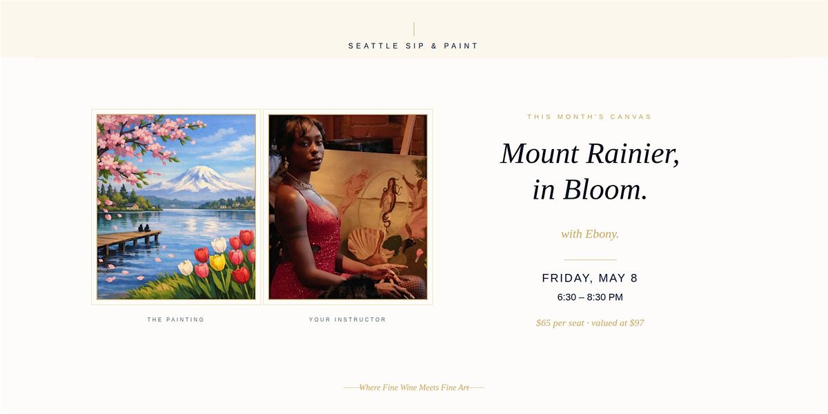 Join us for an elevated evening where fine wine meets fine art right in the heart of Seattle. In this 2-hour guided painting experience, instructor Ebony will walk you step-by-step through "Mount Rainier in Bloom" a stunning 8×10 canvas featuring cherry blossoms, a lakeside dock, and colorful tulips with Mt. Rainier in the distance.