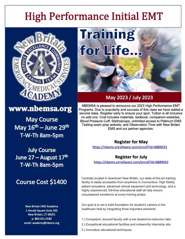 NBEMSA is pleased to announce our 2023 High Performance EMT Programs. Due to popularity and success of this class we have added a second class. Register early to ensure your spot. Tuition is all inclusive no add ons. Cost includes materials, textbook, companion websites, Blood Pressure Cuff, Stethoscope, unlimited access to Platinum EMS Testing exam prep website, and Observation Time with New Britain EMS and our partner agencies.