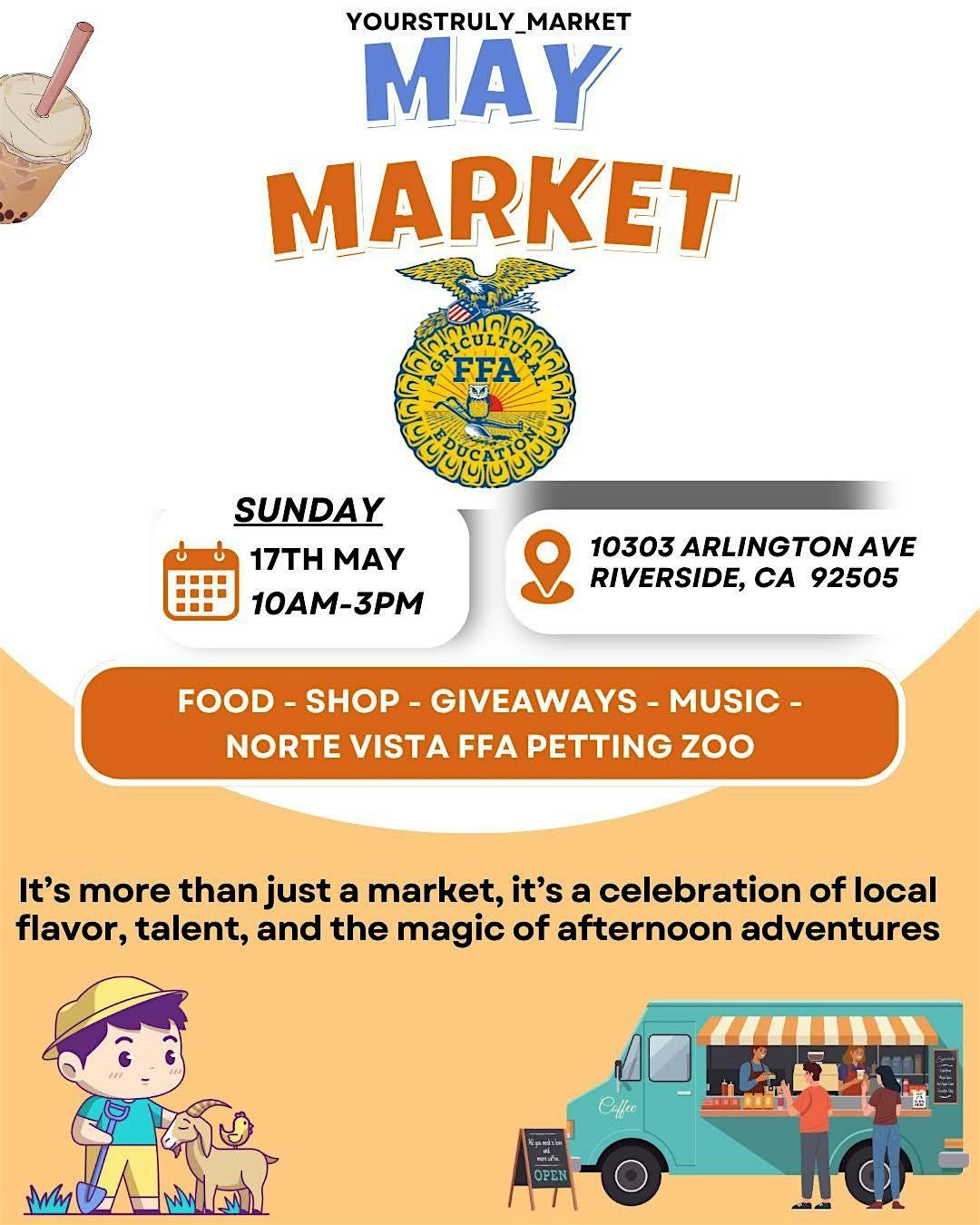 #MayMarket #RiversideEvents #ShopLocal #SupportSmallBusiness #VendorMarket #FamilyFun #PettingZoo #SundayFunday #YourstrulyMarket #nortevistaffa