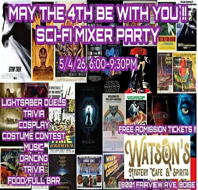 May The 4th Be With You!” Sci-Fi Mixer Party, 5/4/26, 6:00-9:30pm @ Watson’s Mystery Cafe 8001 W Fairview Ave, Boise, Cosplay encouraged! Come as your favorite character. FREE admission, 18+, 2 item minimum, dinner menu/full bar, Sci-Fi themed cocktails, music, trivia, costume contest, lightsaber duels, performances, comedy, mingling and dancing until the cows come home… or at least 9:30pm