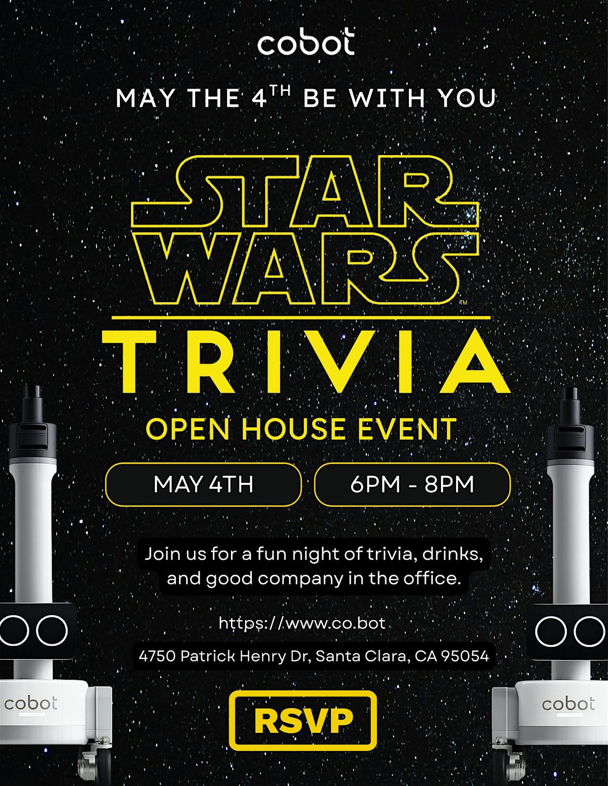 Get ready to test your Star Wars knowledge at Cobot HQ on May 4, 2026 at 6:00 PM! Join us for a fun and casual trivia night where fans of all ages can show off their skills. Whether you’re a Jedi master or just love trivia, there’s something for everyone. Bring your friends, enjoy some friendly competition, and may the force be with you!