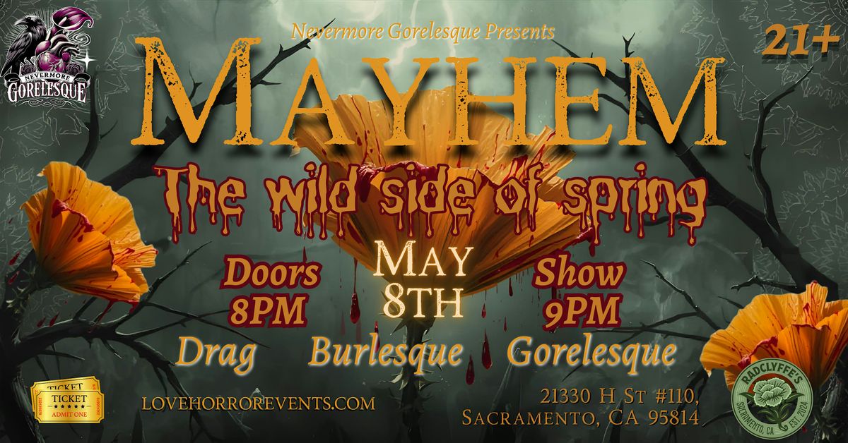 Join us May 8th at Radclyffe's Bar for MAYHEM: The Wild Side of Spring- a fierce, untamed night celebrating rebirth, storms, florals, and feral energy through electrifying performance.