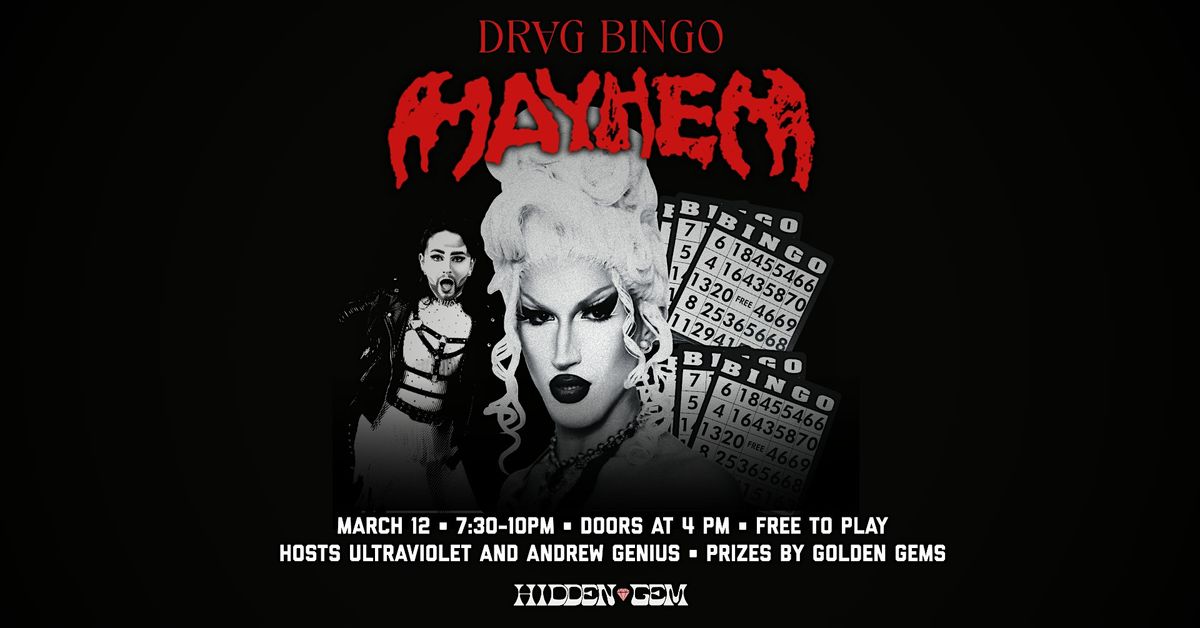 How bad do you want to go to Mayhem Drag Bingo ?! Probably really bad because we've got the incredible Ultraviolet and Andrew Genius hosting, themed cocktails, and prizes from Golden Gems! It's the perfect way to celebrate one year of Mayhem! See you there!