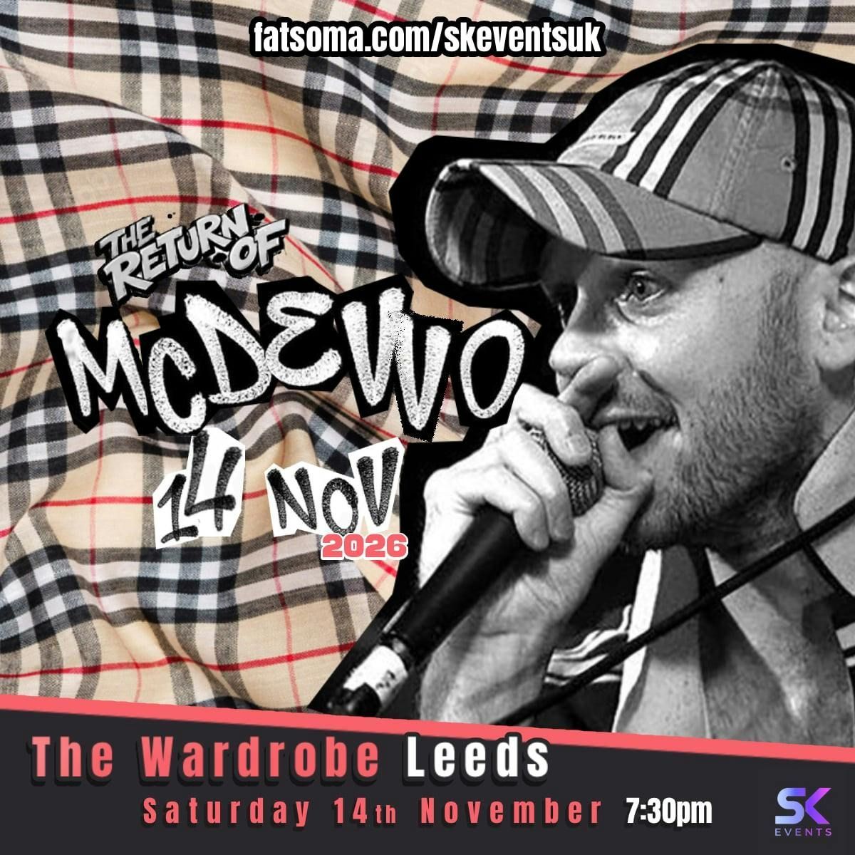 Join us at The Wardrobe, Leeds on 14th November 2026 for the long awaited return of the Donny soldier himself.....MC DEVVO! Devvo is a satirical character created by David Firth and played by Darren Derbyshire who first appeared on fat-pie.com back in 2004 pre dating YouTube.An early pioneer of internet comedy videos he quickly blew up on MySpace. By 2006 he appeared on his own show on Channel 4’s E4 station.As a national phenomenon he changed his name to MC Devvo and embarked on a rap career that saw him tour the UK