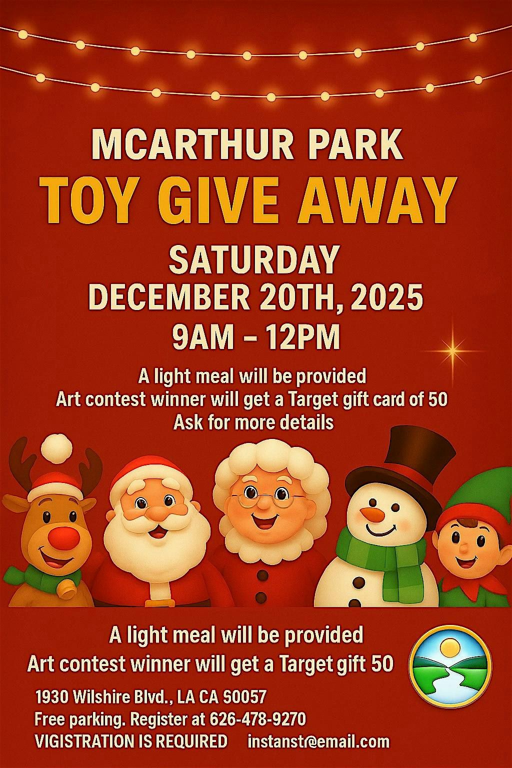 Join us for the McArthur Park Toy Give Away. Registration is required so we can plan enough toys and meals for everyone. Text 626-478-9270