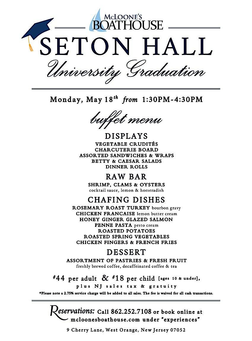 Join us at McLoone's Boathouse on May 18, 2026 at 1:30 PM (Eastern Time) to celebrate Seton Hall's graduation day with a nice laid-back brunch. It's the perfect way to chill with friends and family, enjoy great food, and soak in the awesome vibes, celebrating the new Graduates. Don’t miss out on this special occasion to toast to new beginnings in style!