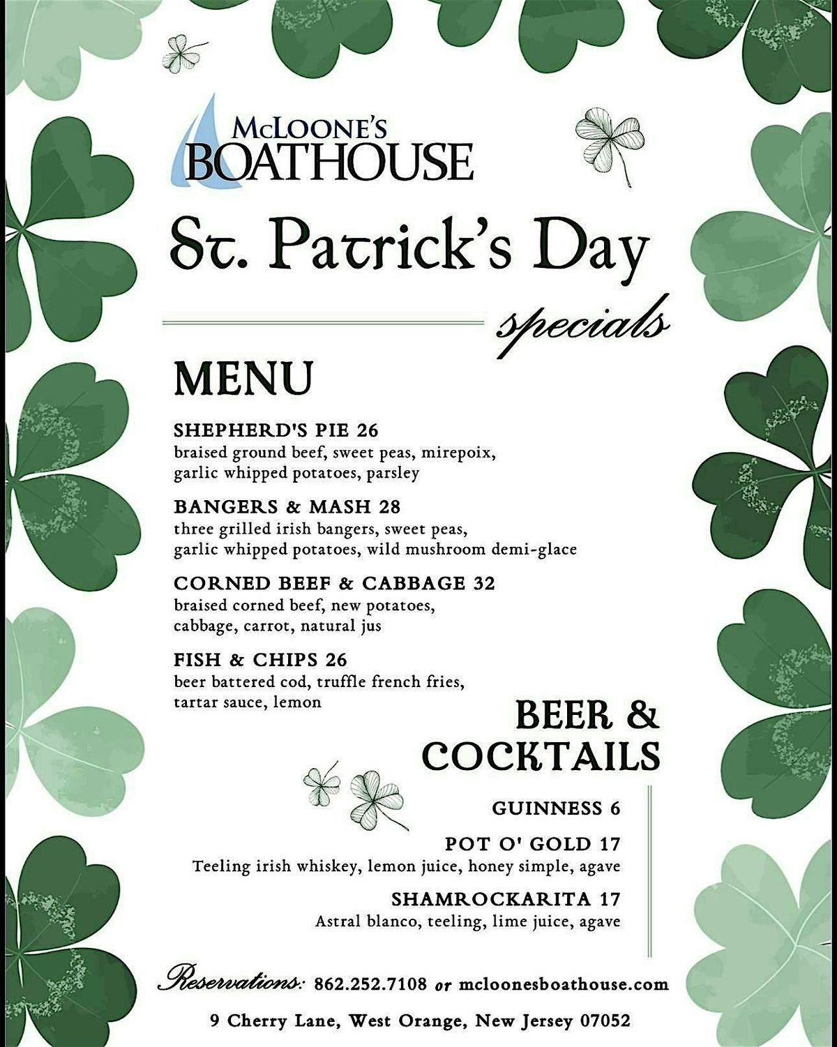 Get ready for a fun-filled day of festivities on March 17, 2026 at 11:00 AM (Eastern Time). Join us for a day of music, cocktails and delicious food from our special St. Patricks Day Menu. Let's celebrate the luck of the Irish together! Don't forget to wear your green attire and get into the St. Patrick's Day spirit. See you there!