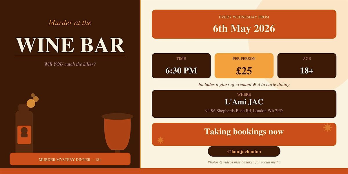 M**der at the Wine Bar is an interactive M**der mystery dining experience hosted every Wednesday at L'Ami JAC in Shepherds Bush. It combines the thrill of a whodunit, the fun of roleplay, and a relaxed evening of dining and drinks — all in one unforgettable night out.