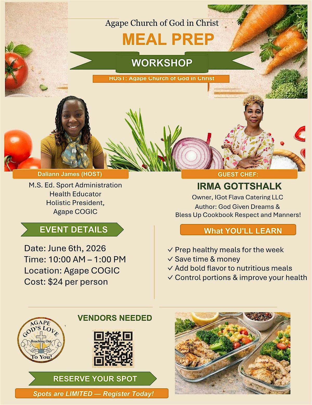 Join us for an impactful and practical Meal Prep Workshop hosted by Agape Church of God in Christ, designed to help you take control of your health, time, and daily routine.
