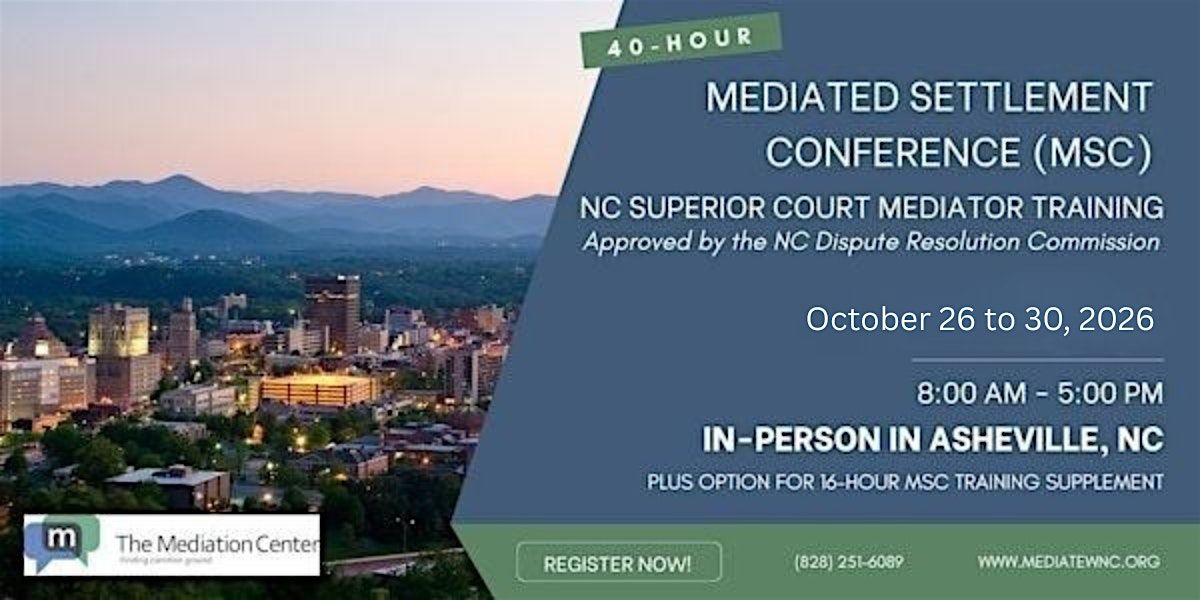 Join The Mediation Center's training team for a 40-hour, in-person Mediated Settlement Conference (MSC) Superior Court Mediator training. The training will fulfill the 40-hour training requirement for the NC Dispute Resolution Commission's Superior Court mediator certification process. The training will take place from Monday, October 26, through Friday, October 30, from 8:00 AM until 5:00 PM.