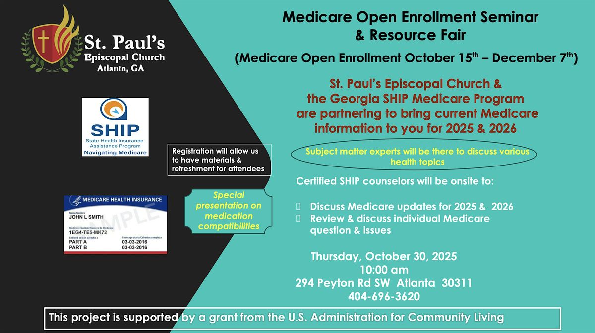 Welcome to the Medicare Open Enrollment Seminar & Resource Fair! Join us at 294 Peyton Rd SW for a day filled with valuable information and resources to help you make the most of your Medicare benefits. Subject matter experts will be there to discuss various health topics. Whether you're new to Medicare or looking to make changes during the open enrollment period, this event is perfect for you. Don't miss out on this opportunity to learn, ask questions, and connect with others in your community. We can't wait to see you there!